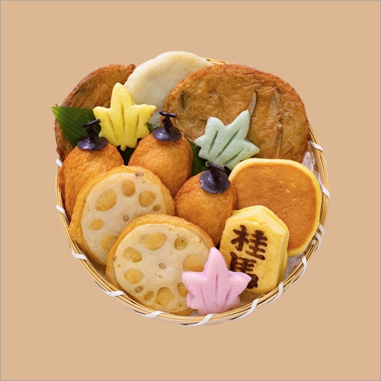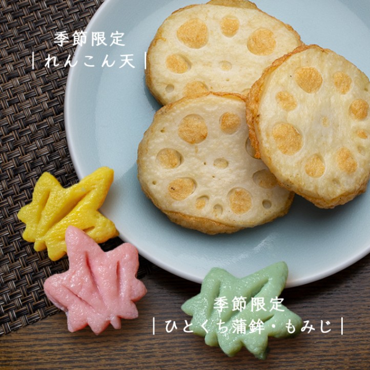 原材料/魚肉(グチ、ハモ、イトヨリ、イカ)、ごぼう、れんこん、卵、砂糖、みりん、塩、昆布だし、澱粉、小麦粉、食物油(大豆)、食物油(コーン、パーム)、ブドウ糖、醤油(大豆・小麦を含む)、魚醤、椎茸(粉末)/着色料(コチニール)
